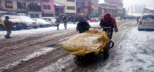 Cart puller making way through snow covered road at Seribazar in Bhaderwah  on Saturday.