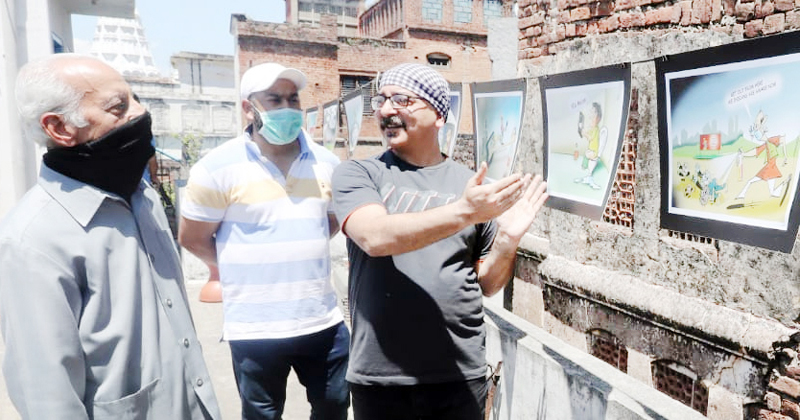 JAMMU, May 5: On National Cartoonists Day, eminent cartoonist of Jammu, Shekhar popular by the name Bunty Cartoonist organized first of its own kind ‘In House Cartoon Exhibition’ with title ‘STAY HOME, STAY SAFE’ at the terrace where he created a gallery with best of 35 cartoons made by him during the ongoing lockdown with themes like social distancing, stay at home, brotherhood in COVID-19, different zones in lockdown, online classes, 4G restoration etc.