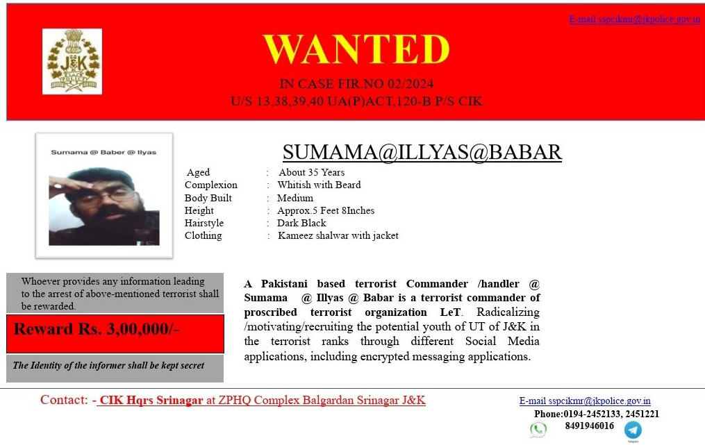 According to CI, the wanted individual is a handler for the prescribed terrorist organization Lashkar-e-Taiba (LeT) and was implicated in FIR number 02/2024 under the UA(P) Act and IPC.