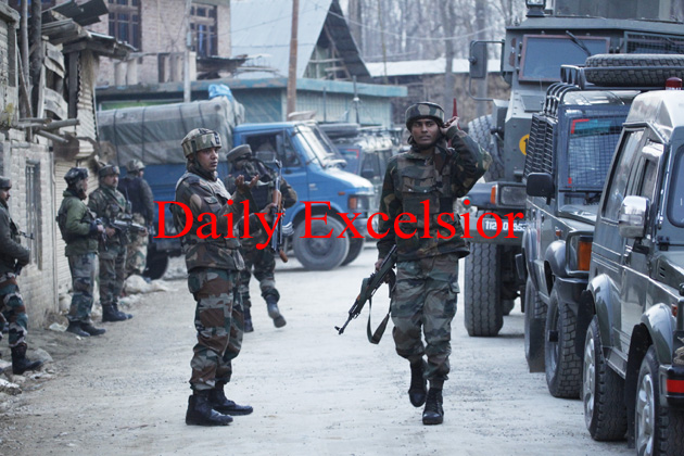 Troops in action at Arwani, Bijbehara after grenade attack on Tuesday. -Excelsior/Sajad...
