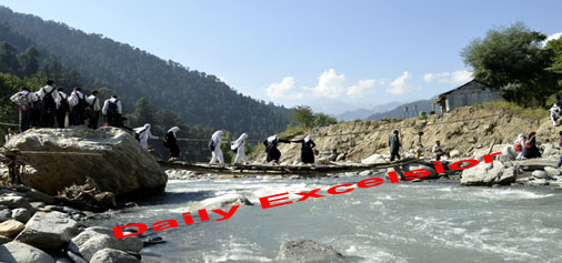 Students crossing a temporary bridge to reach their school in Boniyar,...