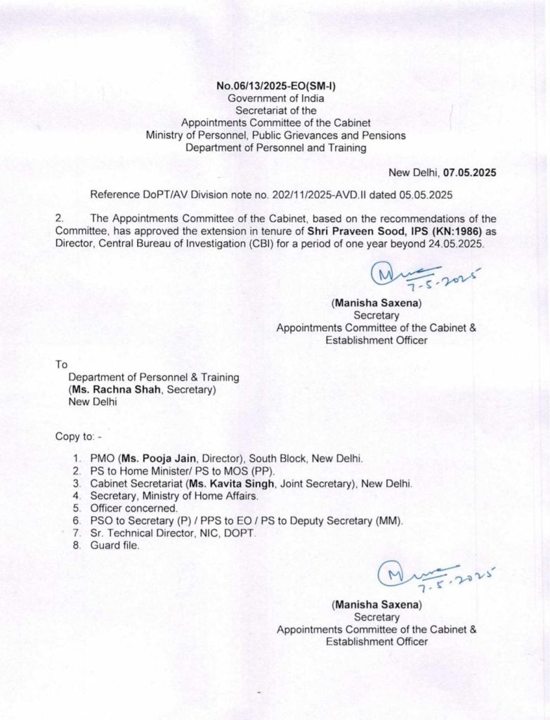 New Delhi, May 7: Central Bureau of Investigation (CBI) Director Praveen Sood has been given service extension for one more year, a Personnel Ministry order said.
