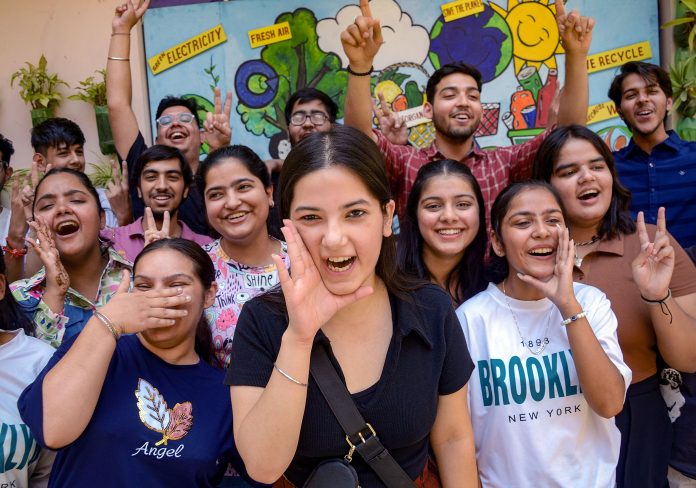 Students celebrate after the announcement of class 12th board exam results by the Central Board of Secondary Education (CBSE), in Amritsar.
