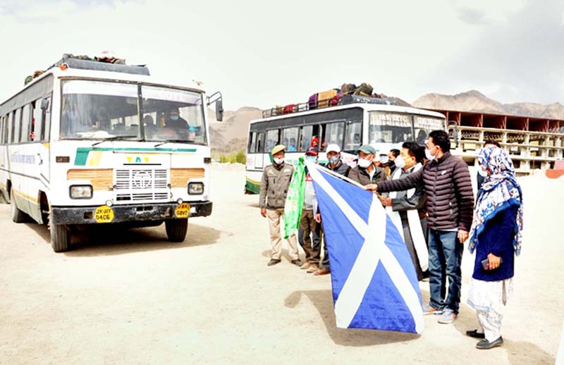 CEC LAHDC Leh flagging off stranded passengers for Zanskar on Monday.