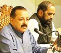 Union Ministers Dr Jitendra Singh and Hansraj Ahir at a press conference in Srinagar on Wednesday.