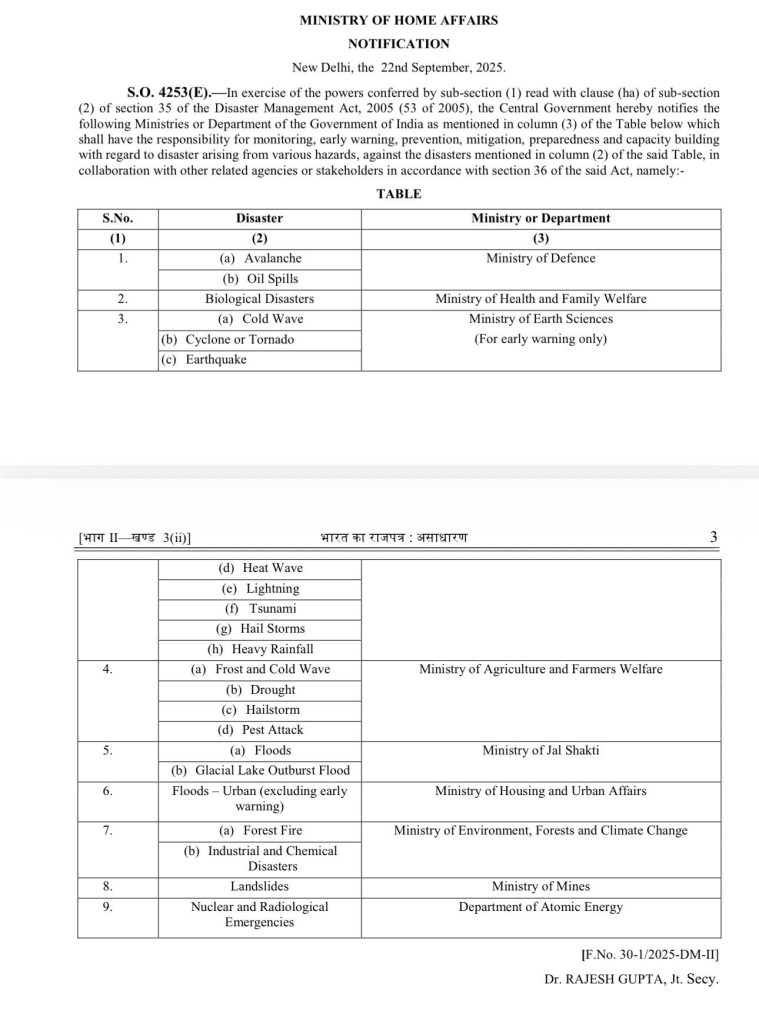 NEW DELHI, Sep 23: The Central Government issued a notification under the Disaster Management Act, 2005, assigning specific Ministries and Departments the responsibility for monitoring, early warning, prevention, mitigation, preparedness, and capacity building for various disasters.