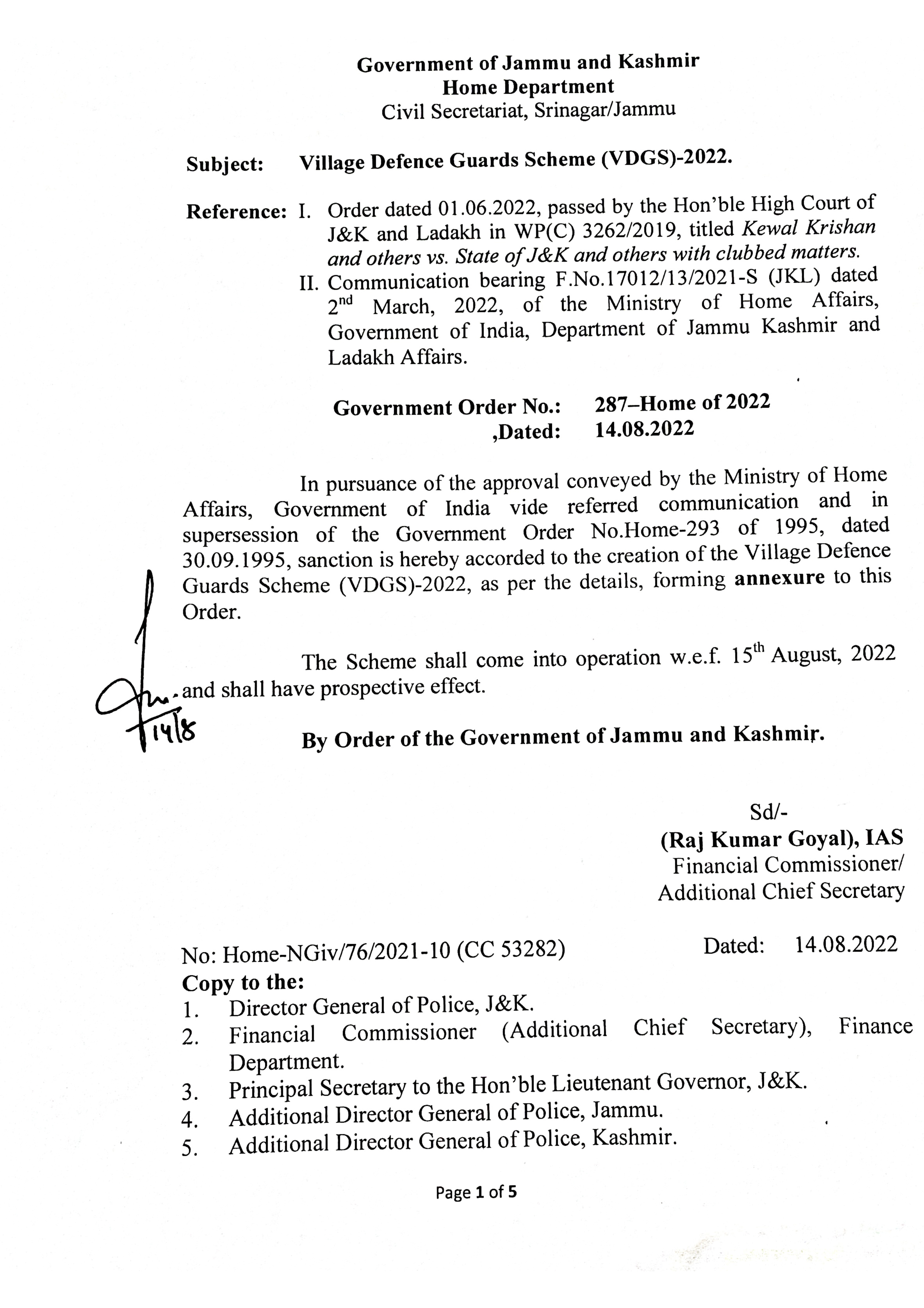 JAMMU, Aug 15: The Government of Jammu and Kashmir has released an official communication regarding the implementation of the Village Defence Guards scheme in the union territory.