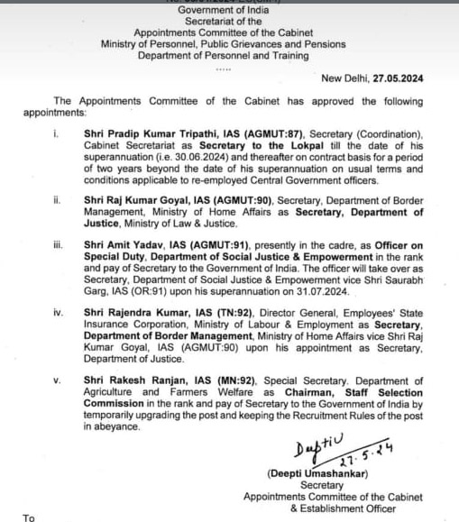 “The officer will take over as Secretary, Department of Social Justice and Empowerment vice Saurabh Garg, IAS (OR:91) upon his superannuation on 31.07.2024,” the order said.