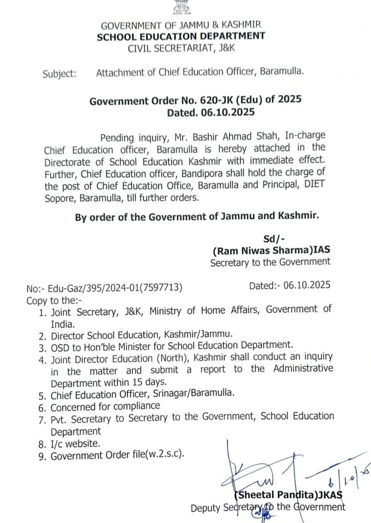 “Pending inquiry, Bashir Ahmad Shah, in charge CEO Baramulla, is hereby attached with the Directorate of School Education Kashmir with immediate effect,” an order issued by the administrative secretary of the School Education Department read.