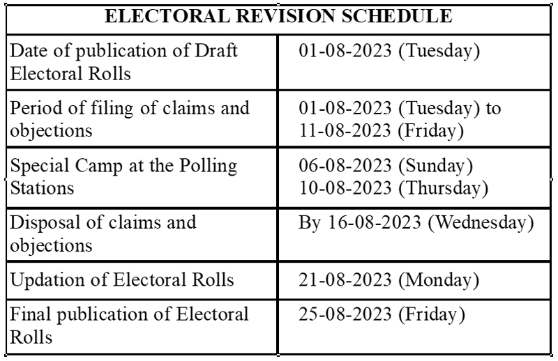 As per the schedule issued by the CEO, draft electoral rolls will be published on August 1. Period for filing of claims and objections will be from August 1-11 while special camp at the Polling Stations will be organised on August 6 and 10.