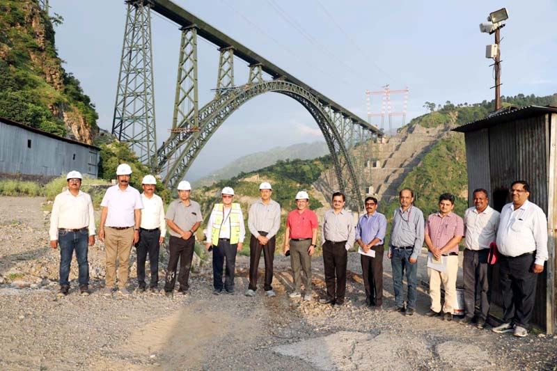 Chairman and CEO of Railway Board, Vinay Kumar Tripathi, posing with engineers while reviewing work on Chenab Railway Bridge in Reasi district.