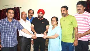 Chairman JKCA Arvinder Singh Micky, former chairman, Romesh Mahajan, member BCCI, Ankush Abrol and other dignitaries presenting a cheque of Rs 2 lakh to the family of Late Barjinder Singh.
