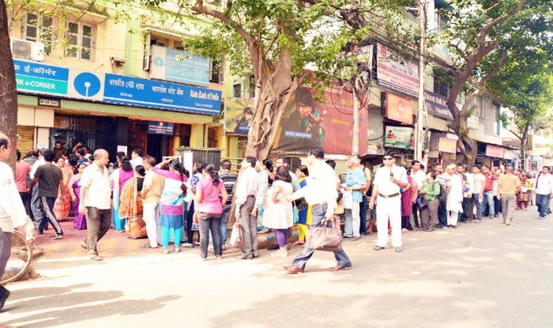 People including elderly and women in large numbers were queueing up to get the valid currency notes needed to meet their daily expenses.