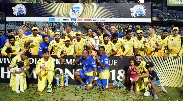 Chennai Super Kings players pose after winning the 2018 Indian Premier League (IPL) Twenty20 final in Mumbai on Sunday. By Daily Excelsior - May 28, 2018 Share FacebookTwitterWhatsAppPinterestLinkedinCopy URLTelegramEmailTumblrReddItPrintKoo Chennai Super Kings players pose after winning the 2018 Indian Premier League (IPL) Twenty20 final in Mumbai on Sunday. Follow our WhatsApp channel