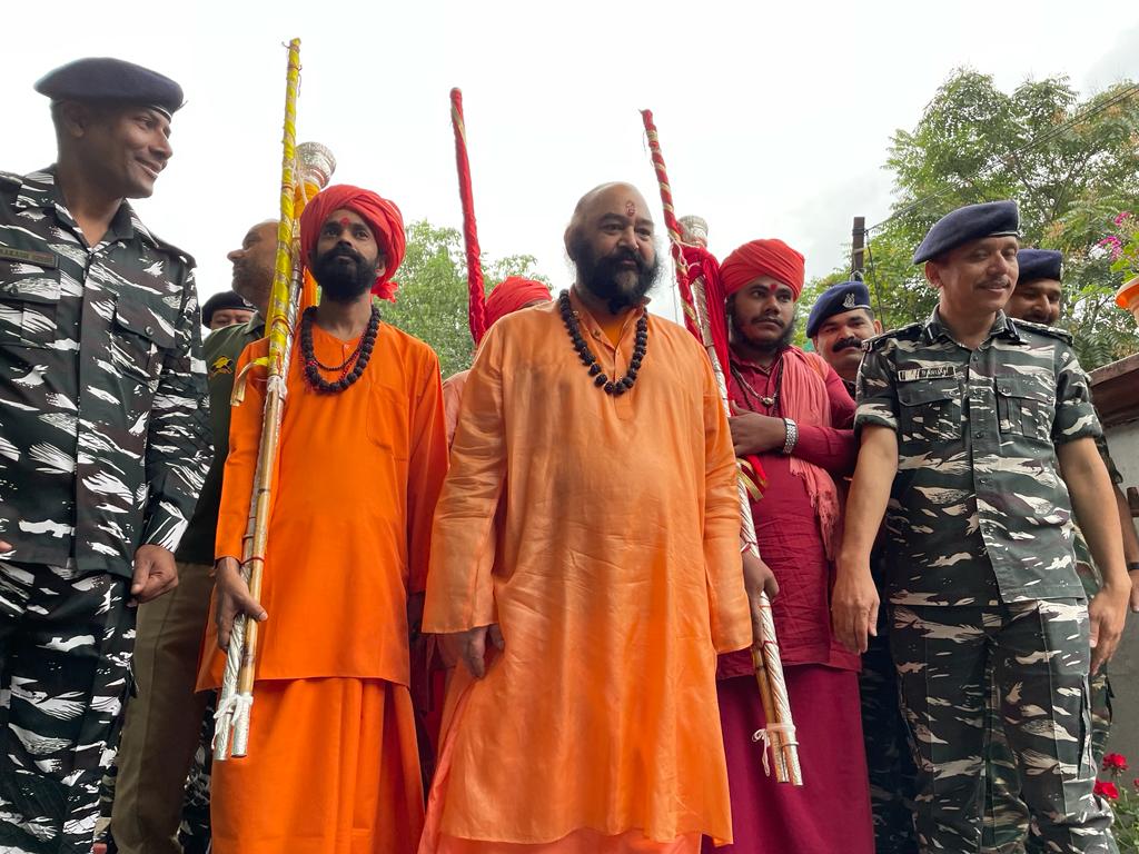 Srinagar, Aug 26: Mahant Deependra Giri, the custodian of the Charri-Mubarak of Swami Amarnath, the holy mace of Lord Shiva, accompanied by a group of Sadhus, left in a bus from Dashnami Akhara Temple Srinagar for the cave shrine to conduct the final rituals of the yatra amid tight security arrangements on Saturday.