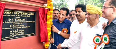 JAMMU, Sept 16: Minister for Medical Education, Technical Education, Youth Services and Sports R S Chib along with Minister of Revenue, Relief and Rehabilitation Raman Bhalla today laid foundation stone of additional academic block in the premises of Government Polytechnic College, Vikram Chowk.