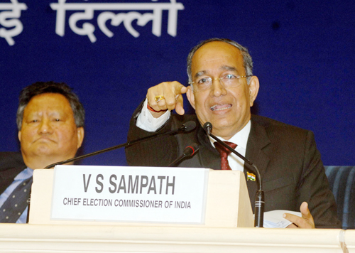 Chief Election Commissioner V S Sampath announcing the schedule of general elections to Lok Sabha and State Legislative Assemblies of Andhra Pradesh, Odisha and Sikkim at a press conference in New Delhi on Wednesday. (UNI)