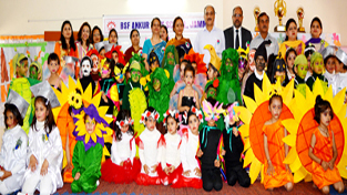 Chief guest, Rakesh Sharma IG BSF Jammu, Pratibha Sharma BWWA president Jammu,  Principal DR S S Khokhar and headmistress posing for group photograph with Ankur kids on Saturday.