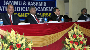 Chief Justice M M Kumar, Justice Tashi Rabstan and Justice B L Bhat during a special lecture organised by State Judicial Academy on Sunday.
