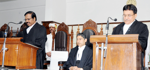 Chief Justice N Paul Vasanthakumar administering oath to Justice Janak Raj Kotwal on Wednesday.