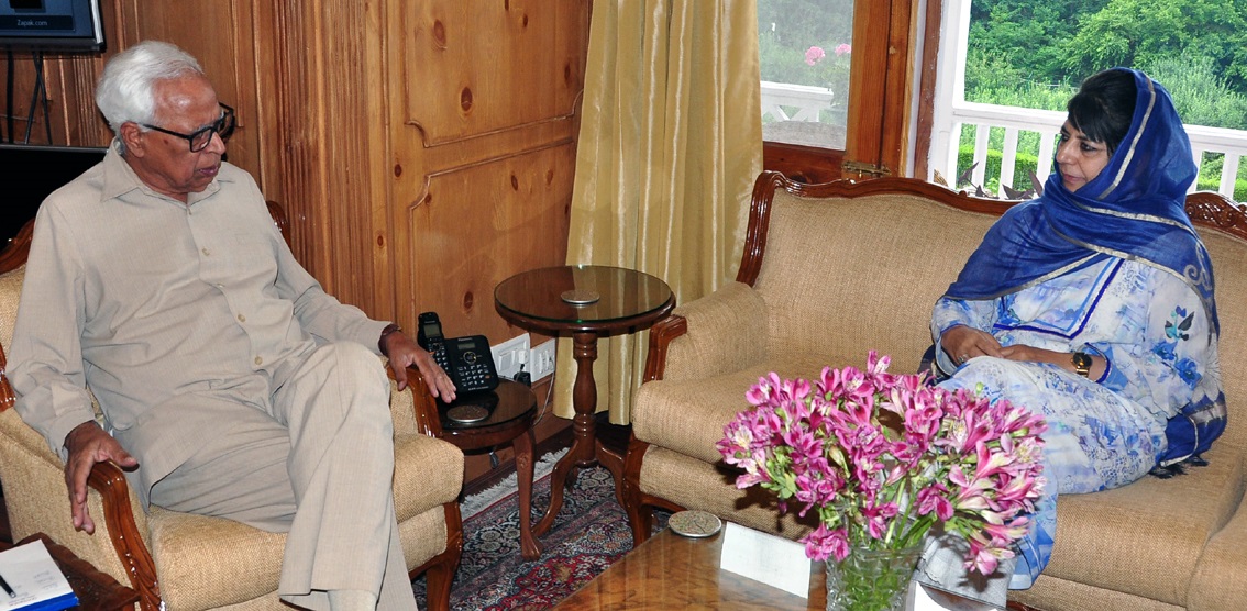 SRINAGAR: Ms. Mehbooba Mufti, Chief Minister J&K, met Governor N.N. Vohra at the Raj Bhavan here today and briefed him about the consultations which had been done and the action under way to finalise the GST framework. Pointing to the consequences of continuing delay in regard to this important issue the Governor advised timely decisions being taken in the interest of safeguarding J&K’s economy and the welfare of the people.