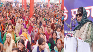 Chief Minister Mehbooba Mufti addressing gathering at Guru Ravi Dass Sabha at Canal Road in Jammu on Wednesday. —Excelsior/Rakesh
