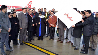 Chief Minister Mehbooba Mufti receiving AirAsia flight in Srinagar on Sunday.