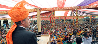 Chief Minister Omar Abdullah addressing a gathering on Guru Ravi Dass Jayanti in Jammu on Monday.