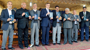 Chief Minister Omar Abdullah along with Minister for Planning Ajay Kumar Sadhotra and officers releasing publications of JKEDI at Pampore on Saturday. -Excelsior/Amin War