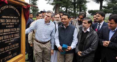 Chief Minister Omar Abdullah alongwith Minister for Tourism, Nawang Rigzin Jora and Forest Minister Mian Altaf laying foundation stone of eco-tourism village at Heerpoora on Sunday.