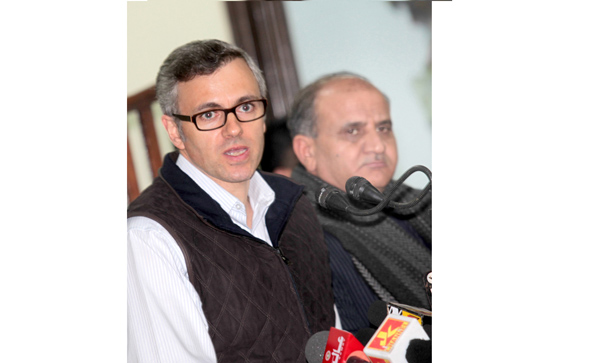 Chief Minister Omar Abdullah and Deputy Chief Minister Tara Chand, who headed the CSC, at a press conference in Jammu on Saturday. —Excelsior/Rakesh