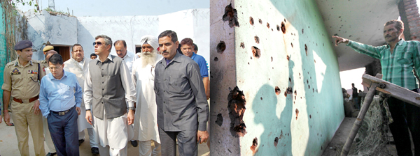 Chief Minister Omar Abdullah at forward village of Nanga in Ramgarh sector while a man shows extensive damage caused to his house in Pak shelling at Garkhal in Akhnoor sector on Friday. -Excelsior pics by Rakesh & Gautam
