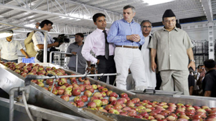 Chief Minister Omar Abdullah, Finance Minister Abdul Rahim Rather and Agriculture Minister Ghulam Hassan Mir visiting the cold chain storage after inaugurating the same at Lassipora on Sunday. -Excelsior/ Sajad Dar