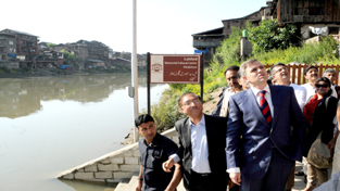 Chief Minister Omar Abdullah having a look at Lal Ded Memorial Cultural Centre on the bank of river Jhelum at Srinagar on Thursday. -Excelsior/Amin War