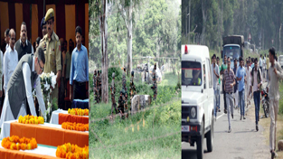 Chief Minister Omar Abdullah laying wreaths on the bodies of martyr cops, Army jawans in action at Mehsar Army camp and people run for safety after fidayeen attack in Samba on Thursday. — Excelsior/Rakesh