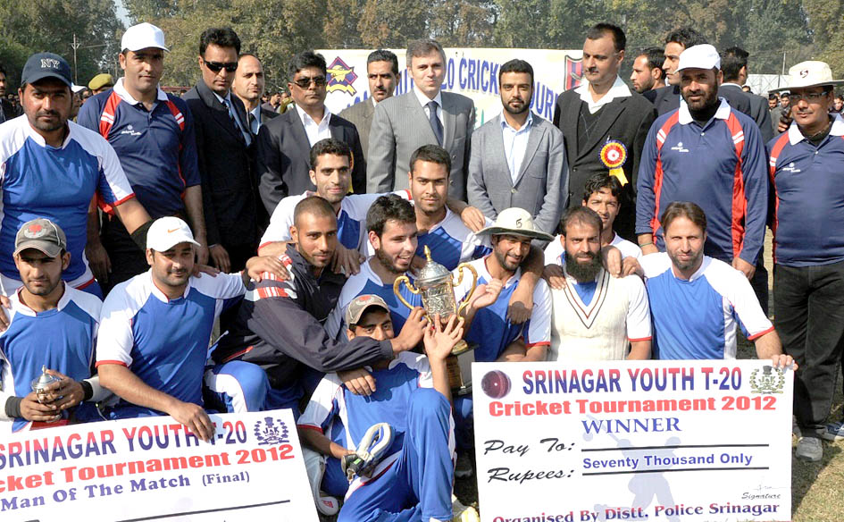 Chief Minister Omar Abdullah posing for a group photograph alongwith the winners of T20 Cricket Tournament during a valedictory function at Srinagar on Thursday.