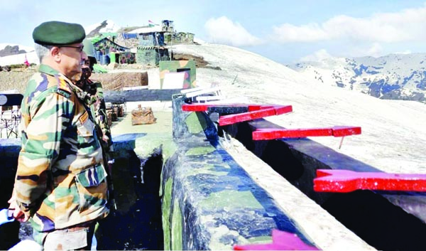 Chief of Army Staff General M M Naravane reviews security situation along the Line of Control during his visit to Kashmir on Thursday. (UNI)