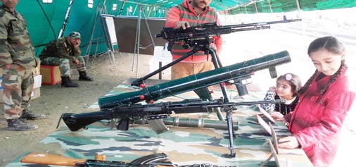 Children keenly observing the hi-tech arms kept on display by 4RR at Bhaderwah campus during Chenab Valley Youth Festival 2015 organized by 4 RR and Bhaderwah campus on Sunday. (UNI)