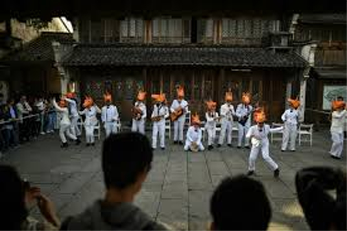 His latest, which debuted on Wuzhen’s centuries-old plazas, was inspired by the police detention this year of a young Chinese cartoonist on vague accusations of “insulting Chinese people” with satirical cartoons depicting them as pig-headed gluttons.