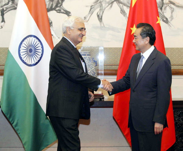 China’s Foreign Minister Wang Yi shakes hands with his Indian counterpart Salman Khurshid during Khurshid’s two-day visit in Beijing on Thursday. (UNI)
