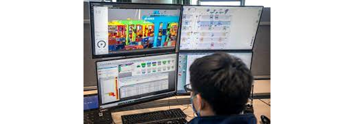 In a third-floor control room with floor-to-ceiling windows that look out over the port, a dozen operators sit in front of displays with as many as six screens showing video feeds of computer-controlled cranes lifting cargo boxes onto or off ships. Each can monitor as many as six cranes at once, unlike a traditional operator who serves only one ship.
