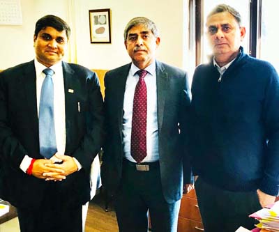 JAMMU, Feb 6: Rahul Sahai, Chairman, Confederation of Indian Industries (CII), J&K State Council and Managing Director, Sahai Group of Companies, along with Rajesh Sharma, Director, SRA Food Beverages Private Limited and CII secretariat called upon Hemant Kumar, Divisional Commissioner Jammu today in his office.
