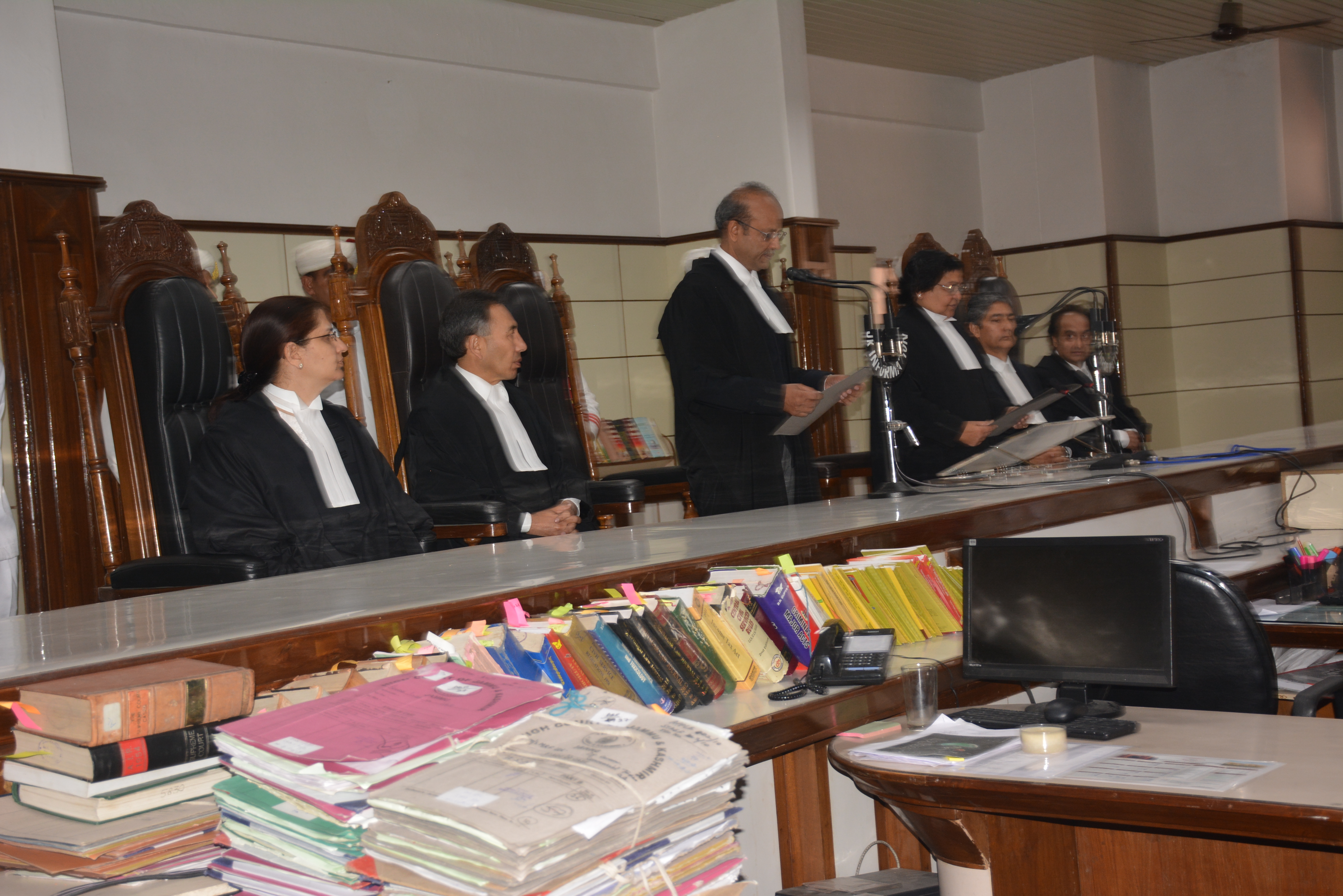 JAMMU:- Chief Justice of Jammu & Kashmir High Court Gita Mittal today administers Oath of office to Justice Rajesh Bindal who is recently transferred from Punjab & Harayan High Court to Jammu & Kashmir High Court at a modest oath ceremony held in the Court Room of the Chief Justice here at High Court Complex.