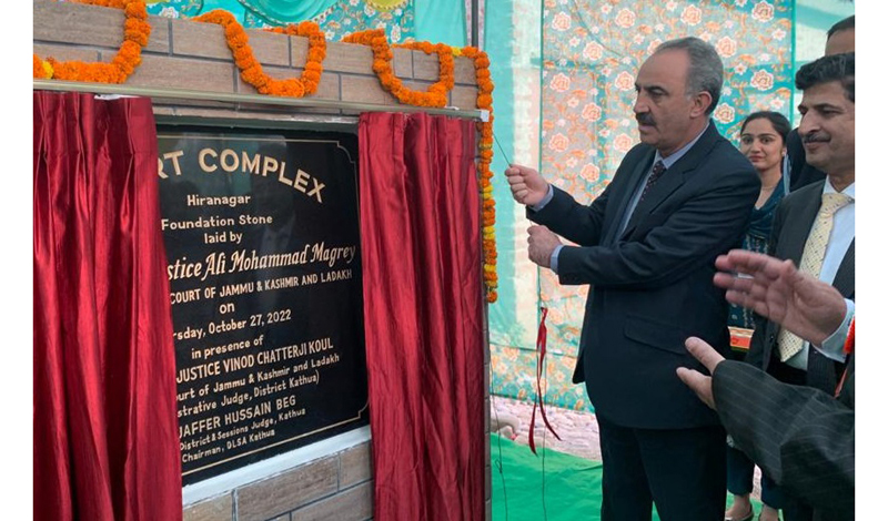 KATHUA, Oct 27: Chief Justice, High Court of Jammu & Kashmir and Ladakh, Justice Ali Mohammad Magrey, today laid foundation stone for Court Complex at Hiranagar besides inaugurating office building of Legal Aid Defence Counsel and Help Desk of e- filing in presence of Justice Vinod Chatterjee Koul who is also Administrative Judge of District Kathua at District Court Complex here.