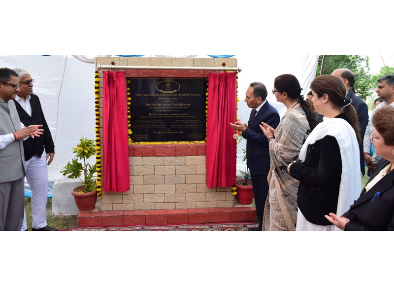 JAMMU, Nov 18: Chief Justice, High Court of Jammu & Kashmir and Ladakh (Patron-in-Chief, J&K Judicial Academy), Tashi Rabstan along with Justice Sindhu Sharma, Chairperson, Governing Committee for J&K Judicial Academy and members of Governing Committee for J&K Judicial Academy, today laid the foundation stone for construction of mini auditorium at J&K Judicial Academy, Janipur.