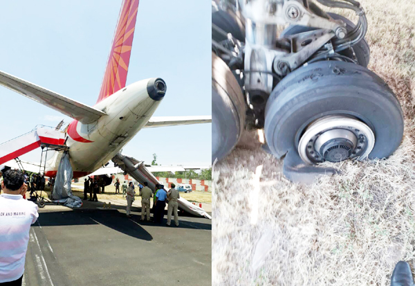 AI plane stranded at runway (left) and burst tyres after landing (right). —Excelsior/Rakesh