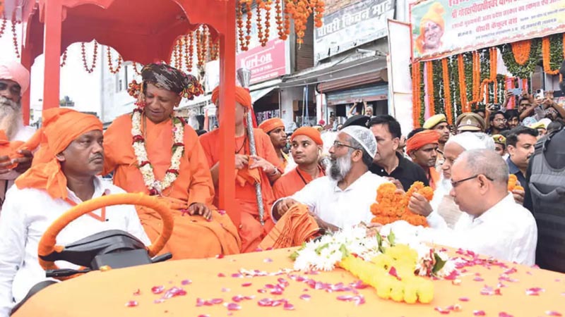 Outgoing chairman of the Urdu Academy, Chaudhary Kaifulwara, on behalf of the weaver community, welcomed Gorakshpeethadhiswar by giving him a flower garland and saffron clothes. (PTI)