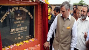 Chief Minister Omar Abdullah laying foundation stone of Employees' Housing Colony at Pampore on Tuesday.