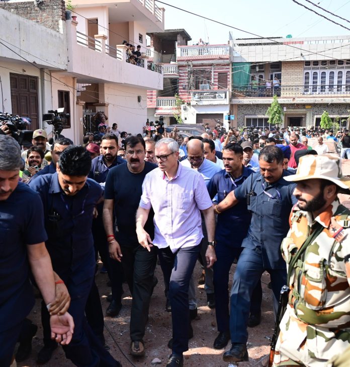 Jammu, May 10: Jammu and Kashmir Chief Minister Omar Abdullah on Saturday visited two residential localities hit by explosions triggered by suspected Pakistani drones or shells, causing damages to a house and several parked vehicles, officials said.