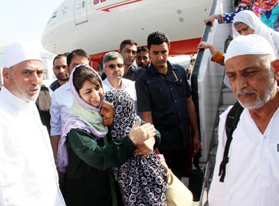 SRINAGAR, Sept 24: Chief Minister, Mehbooba Mufti today received the first batch of Hajj pilgrims at the Srinagar International Airport, who returned from Saudi Arabia after performing the Haj-e-Baitullah.